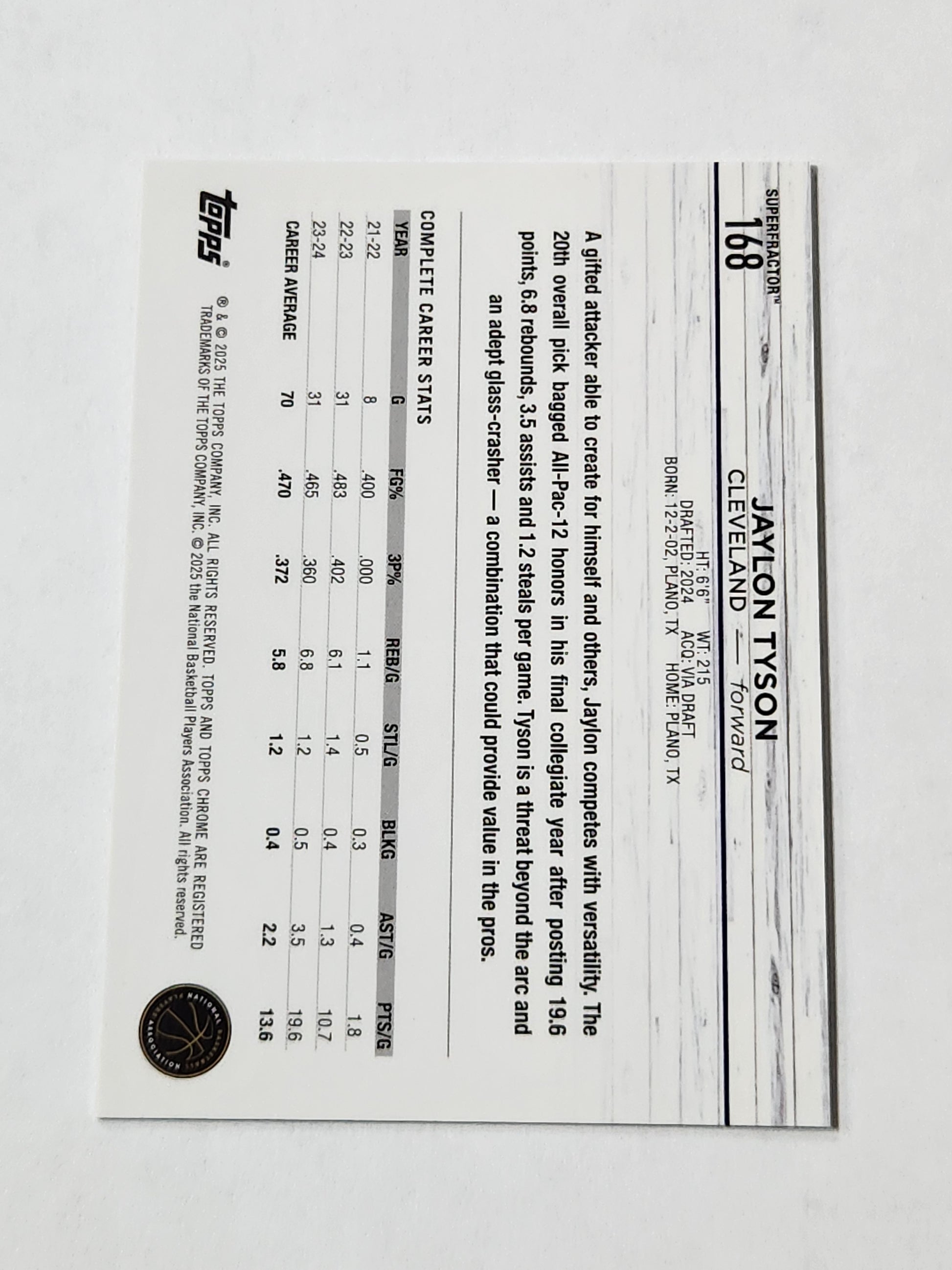 2025 Topps Chrome Jaylon Tyson RC Superfractor 1/1 one of one Cavaliers Gold