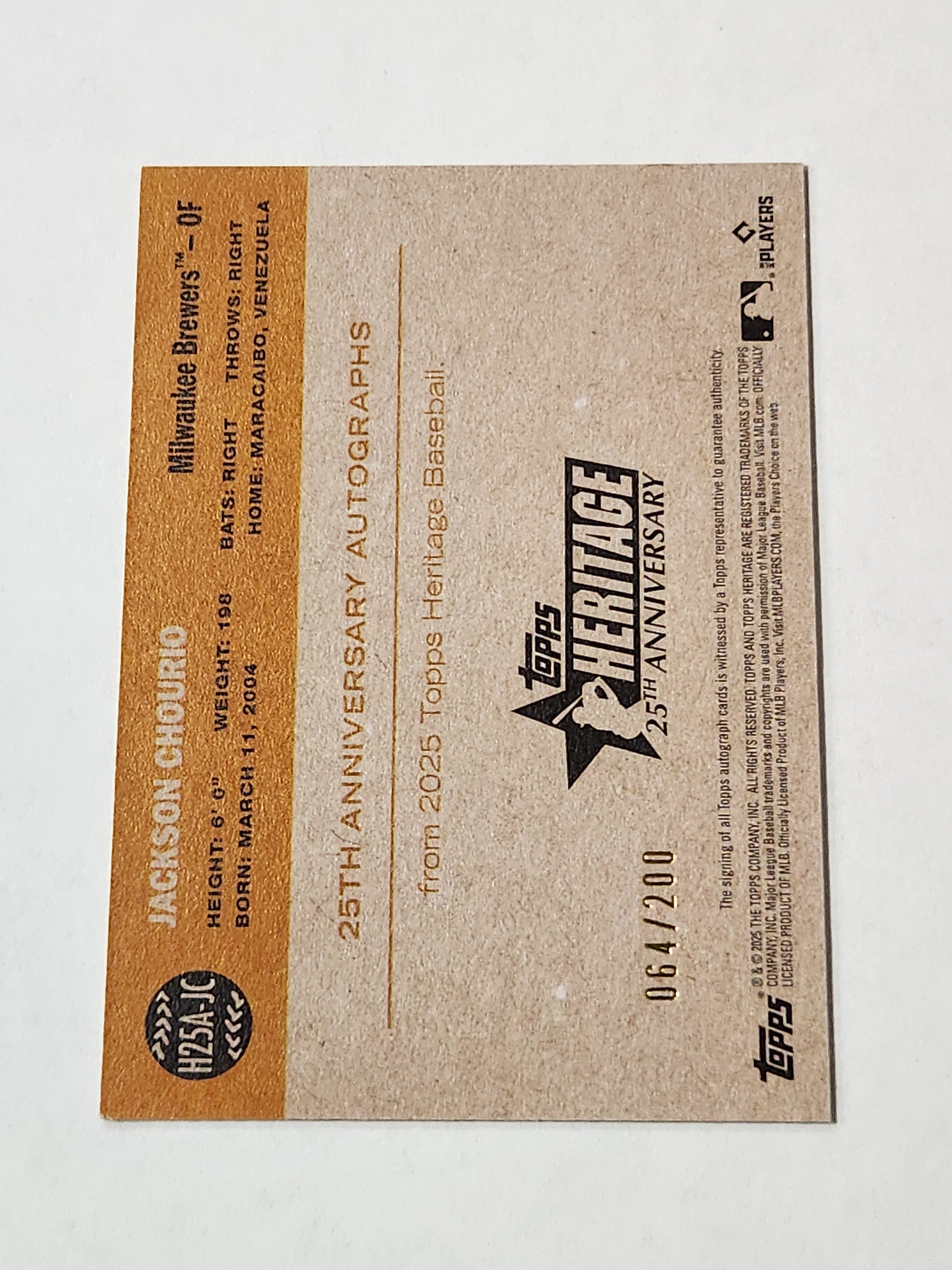 2025 Topps Heritage Jackson Chourio 25th Anniversary On Card Auto /200